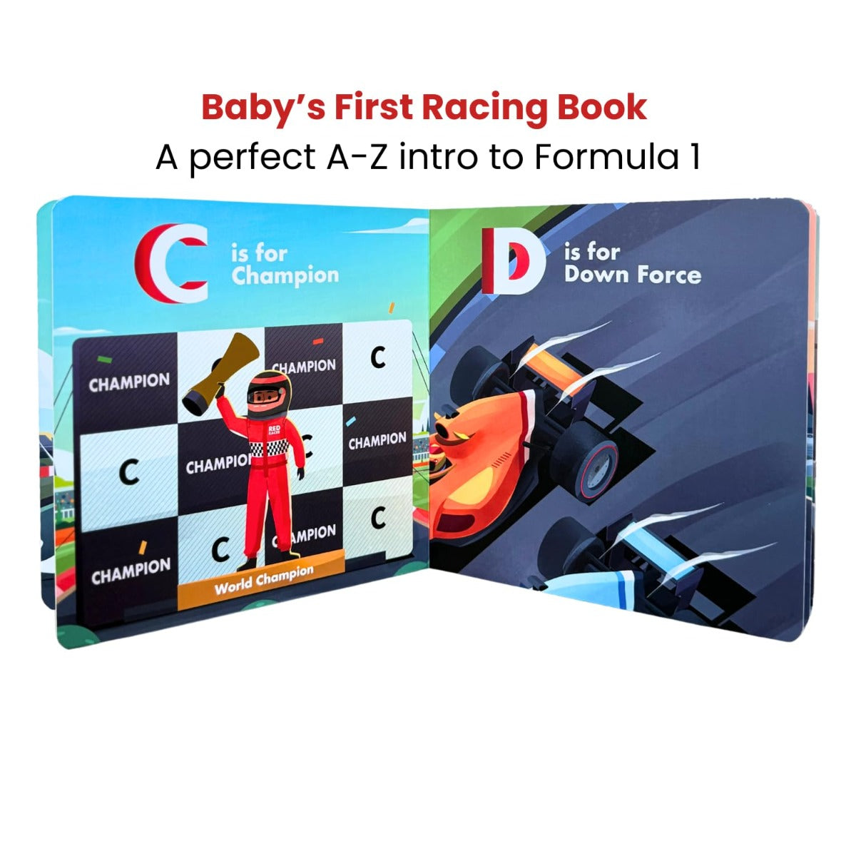 Each letter introduces a key racing term, helping young minds develop early literacy skills while learning about the fast-paced world of Formula 1. The high-contrast, full-color illustrations capture their attention, making this a book they’ll ask to read over and over again.