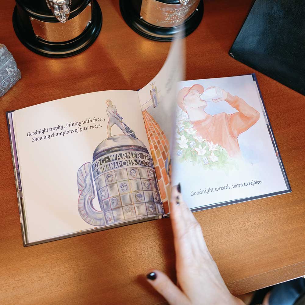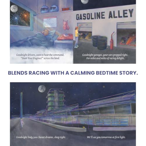 Goodnight Racetrack takes young readers on a soothing bedtime journey around the legendary Indianapolis Motor Speedway®. Through gentle rhyming verses and enchanting illustrations, this beautifully crafted book says goodnight to the most iconic elements of the track—from the roaring race cars to the towering Pagoda under the moonlight.