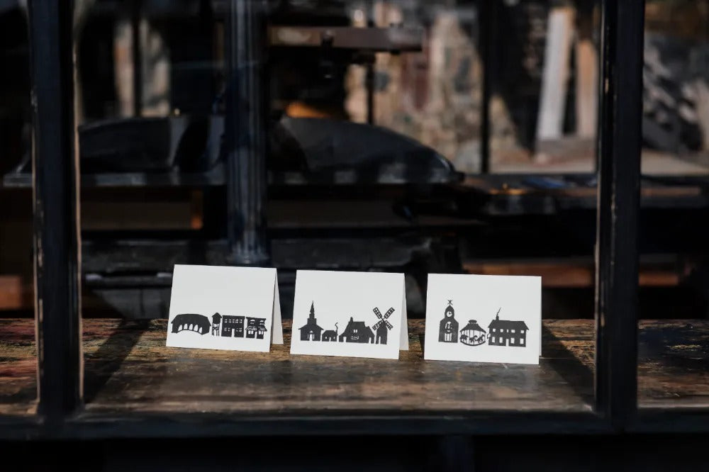 Send a note featuring your favorite Greenfield Village landmarks! Each card is printed on our 1880’s treadle press utilizing photopolymer plates with black ink on Pop-Tone Whip Cream card stock produced at French Paper in Niles, Michigan. Each set of 3 includes natural color envelopes. 4.25" x 5.5".