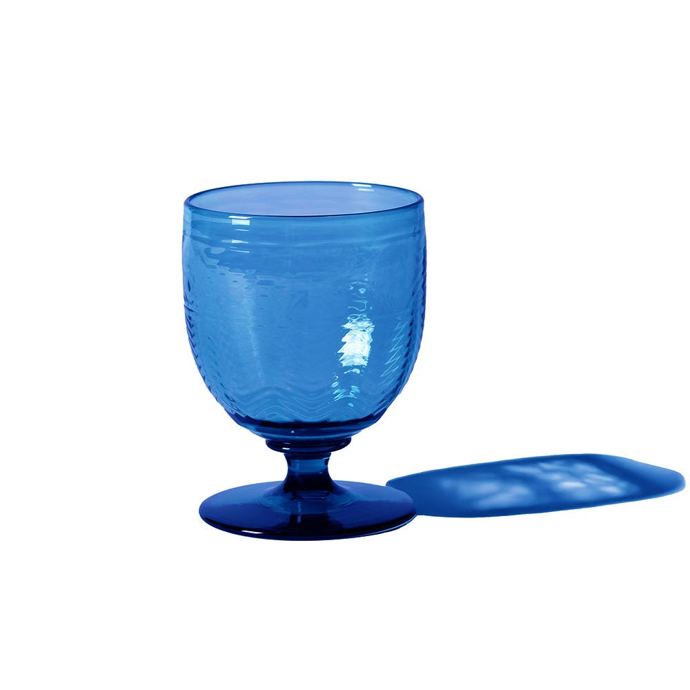 The wine goblet is made by pressing the glass material into the mold to create the pattern, then reheating the piece to shape it and finally adding the footed stem to the bottom. Perfect for serving your favorite wine or beverage of choice. Handmade glass item, size and shape may vary slightly. 3.25”x3.25”x4.25”.