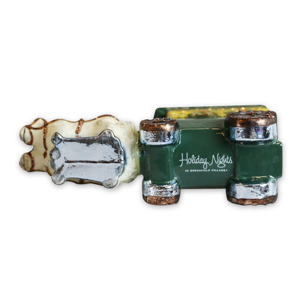 Recapture the wonder of your carriage ride through the historic streets of Greenfield Village with this beautiful glass ornament. Each intricate detail transports you back to the quaint, bygone era you experienced during your visit. Display this ornament on your tree or give it as a thoughtful gift to evoke cherished memories of your time in this iconic Michigan destination.