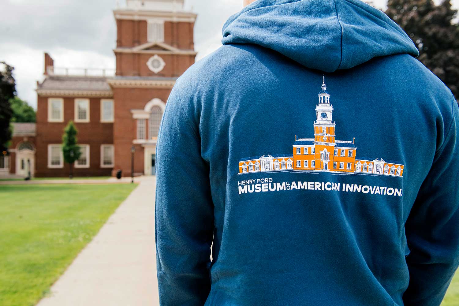 This zip up sweatshirt features customized artwork depicting the architecture of the museum on the back and the logo for The Henry Ford Museum of American Innovation on the front. The t-shirt is made by Wearsponsible, maker of responsibly made goods that, from seed to sew, are of the highest qualty and built to last. Makes a great gift for anyone who has visited the Henry Ford Museum of American Innovation.